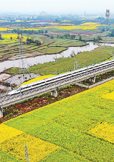 Along the shores of Poyang Lake in spring, vitality can be seen everywhere as agricultural preparation activities proceed orderly. The photo shows that on March 17, a high speed train is traversing the Poyang Lake Bridge in the Hangzhou-Nanchang High Speed Railway, located in Yugan County, Shangrao City, Jiangxi Province. The blooming rapeseed flowers in the nearby fields complement the picturesque scene.