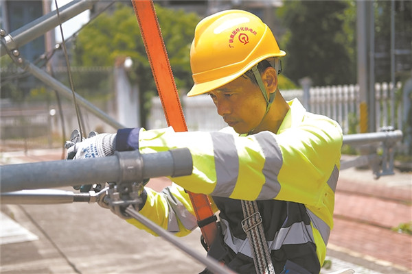 “那時(shí)候總想多學(xué)多練,每天能調整20組?!崩钏芍鲃?dòng)請纓高空作業(yè),扛著(zhù)15公斤工具日行10余公里。每到一處下錨位置,他就攀到支柱上,頂著(zhù)烈日卸載補償繩,直至調整到位。經(jīng)年累月,紫外線(xiàn)在他皮膚上烙下了麥色印記。