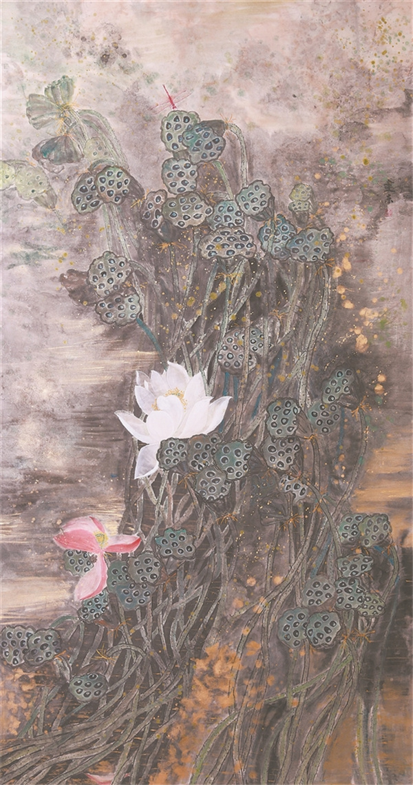 在2023年入選“中國夢(mèng)·勞動(dòng)美”全國職工書(shū)畫(huà)展的作品《野趣》中,他用焦墨皴擦出山巖的嶙峋,以淡彩點(diǎn)染軌旁叢生的野菊,畫(huà)面一角隱約可見(jiàn)一列動(dòng)車(chē)組穿隧而過(guò),動(dòng)靜相生間,工業(yè)與自然達成微妙平衡。另一幅《金色池塘》則聚焦鐵路沿線(xiàn)風(fēng)光,秋日余暉灑在水塘上,塘中荷葉搖曳生姿,他將鐵路沿線(xiàn)風(fēng)景描繪得栩栩如生。