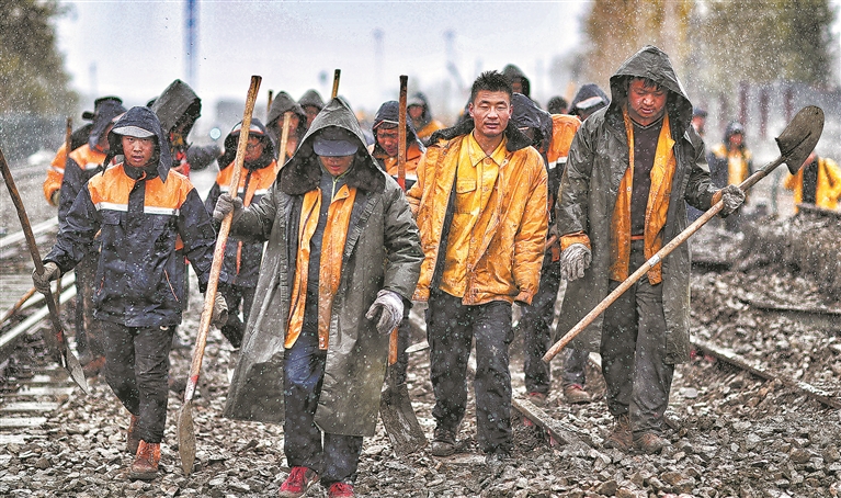 故事:烏魯木齊高鐵工務(wù)段職工在甘泉堡站冒著(zhù)雨雪更換道岔,作業(yè)結束后,他們又趕往下一個(gè)更換道岔點(diǎn)