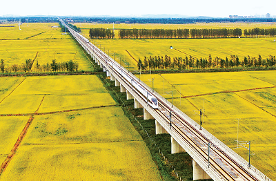 在江蘇省昆山市,動(dòng)車(chē)組列車(chē)通過(guò)京滬高鐵丹昆特大橋陽(yáng)澄湖段。 計海新攝(新華社發(fā))