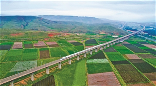 科技日報:一列動(dòng)車(chē)組列車(chē)疾馳在蘭張高鐵蘭武段下河東特大橋上