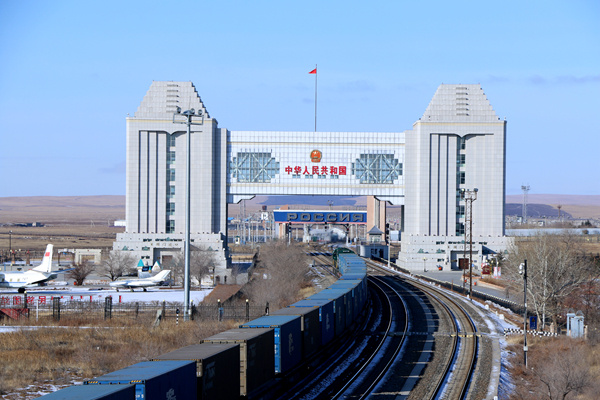 滿(mǎn)洲里鐵路口岸站,一列中歐班列從國門(mén)通過(guò)。國鐵集團供圖