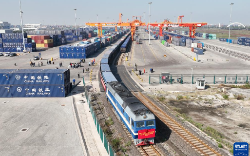 10月13日拍攝的天津-中亞圖定班列首發(fā)現場(chǎng)。當日,伴隨嘹亮悠長(cháng)的鳴笛聲,一列滿(mǎn)載家電產(chǎn)品、汽車(chē)配件等貨物的中亞班列從中鐵天津集裝箱中心站出發(fā),將經(jīng)由霍爾果...