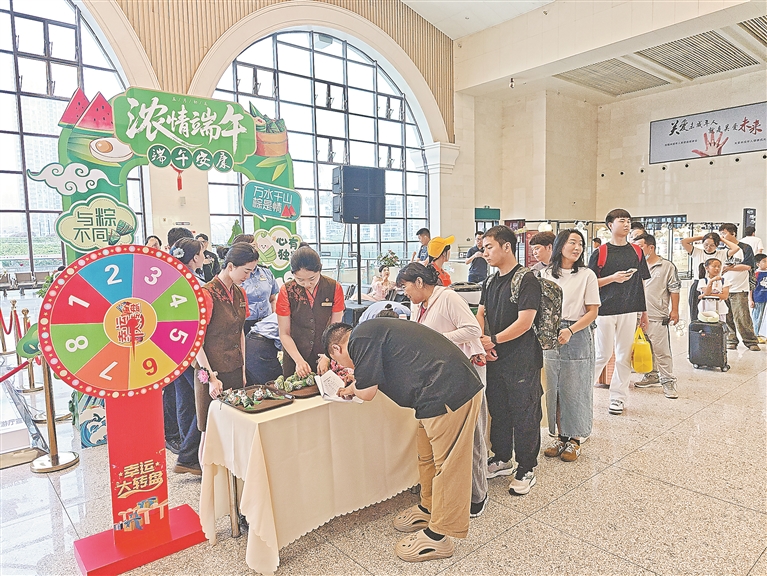 漢口站開(kāi)展趣味轉盤(pán)抽獎活動(dòng),向旅客贈送香囊、手串等小禮品。邱晟 攝
