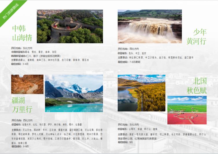 熊貓旅游列車(chē)中韓山海情”跨國旅游以及“少年黃河行”“疆湖萬(wàn)里行”“北國秋色賦”“遠征額濟納”“獅舞南中國”“探幽光霧山”等特色主題旅游產(chǎn)品,豐富的旅游產(chǎn)品和優(yōu)質(zhì)的旅行服務(wù)收獲了廣大游客的好評。